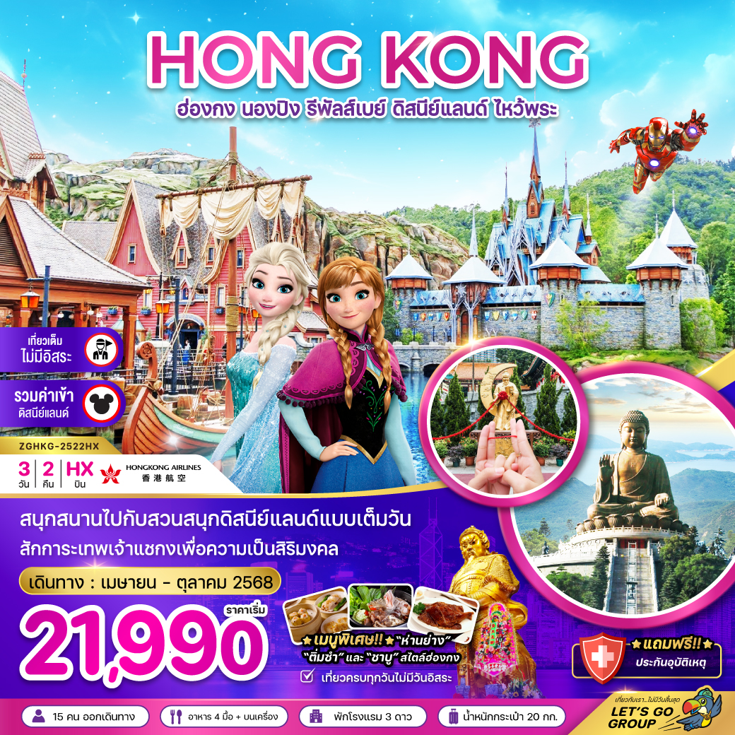 เที่ยวฮ่องกง ไหว้พระ 5 วัด : วัดกวนไท, เจ้าแม่กวนอิมริมทะเล, เจ้าแม่กวนอิมฮองฮำ, วัดหวังต้าเซียน, วัดแชกงหมิว สนุกเต็มวัน ฮ่องกงดิสนีย์แลนด์ (รวมบัตร) ชมโชว์แสง สี เสียง SYMPHONY OF LIGHT ริมอ่าววิคตอเรีย ช้อปปิ้งจุใจ : ย่านจิมซาจุ่ย และย่านมงก๊ก พิเศษเมนู ชาบูชาบูสไตล์ฮ่องกง // พักโรงแรมใกล้แหล่งช้อปปิ้งทุกคืน